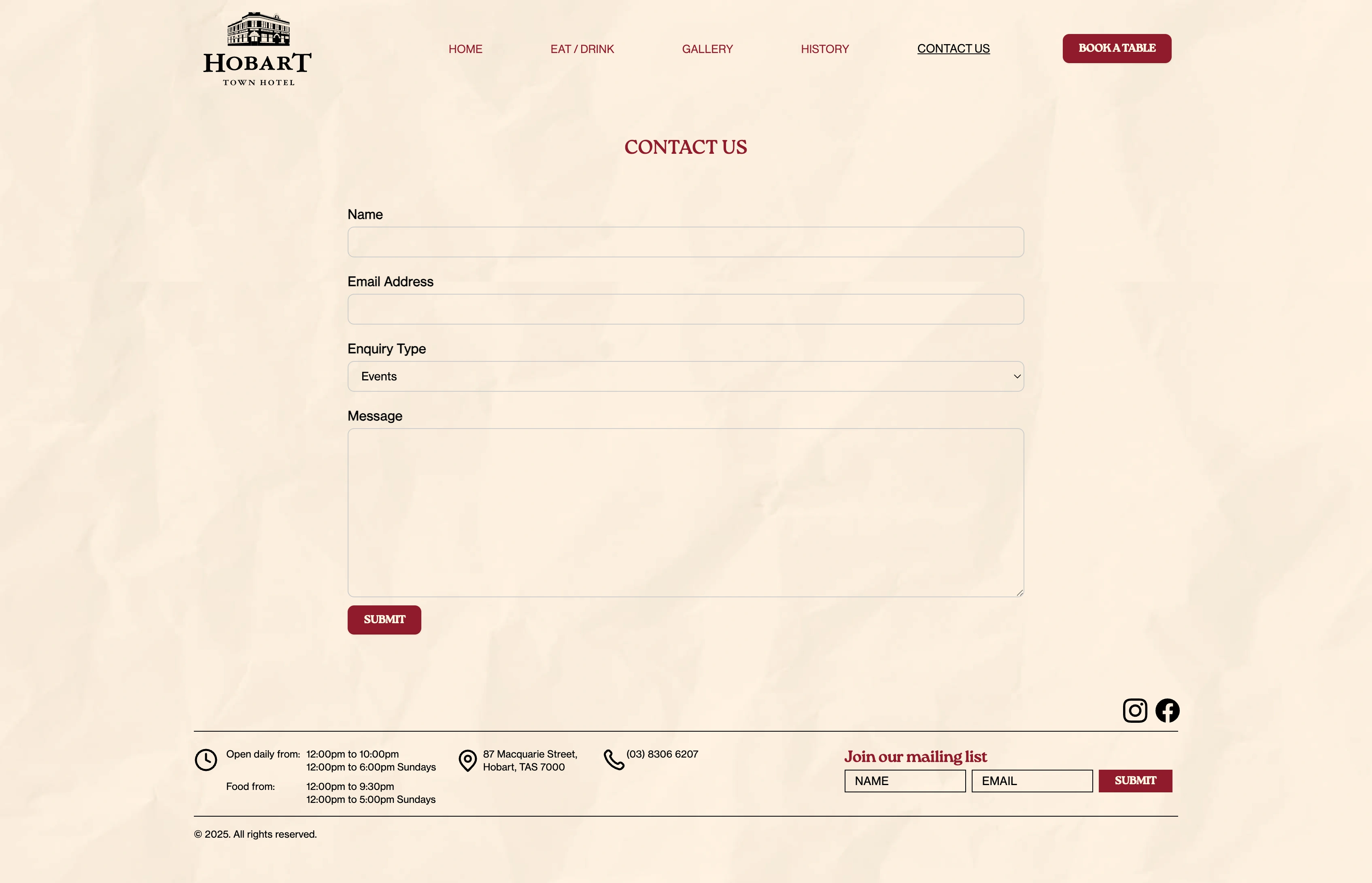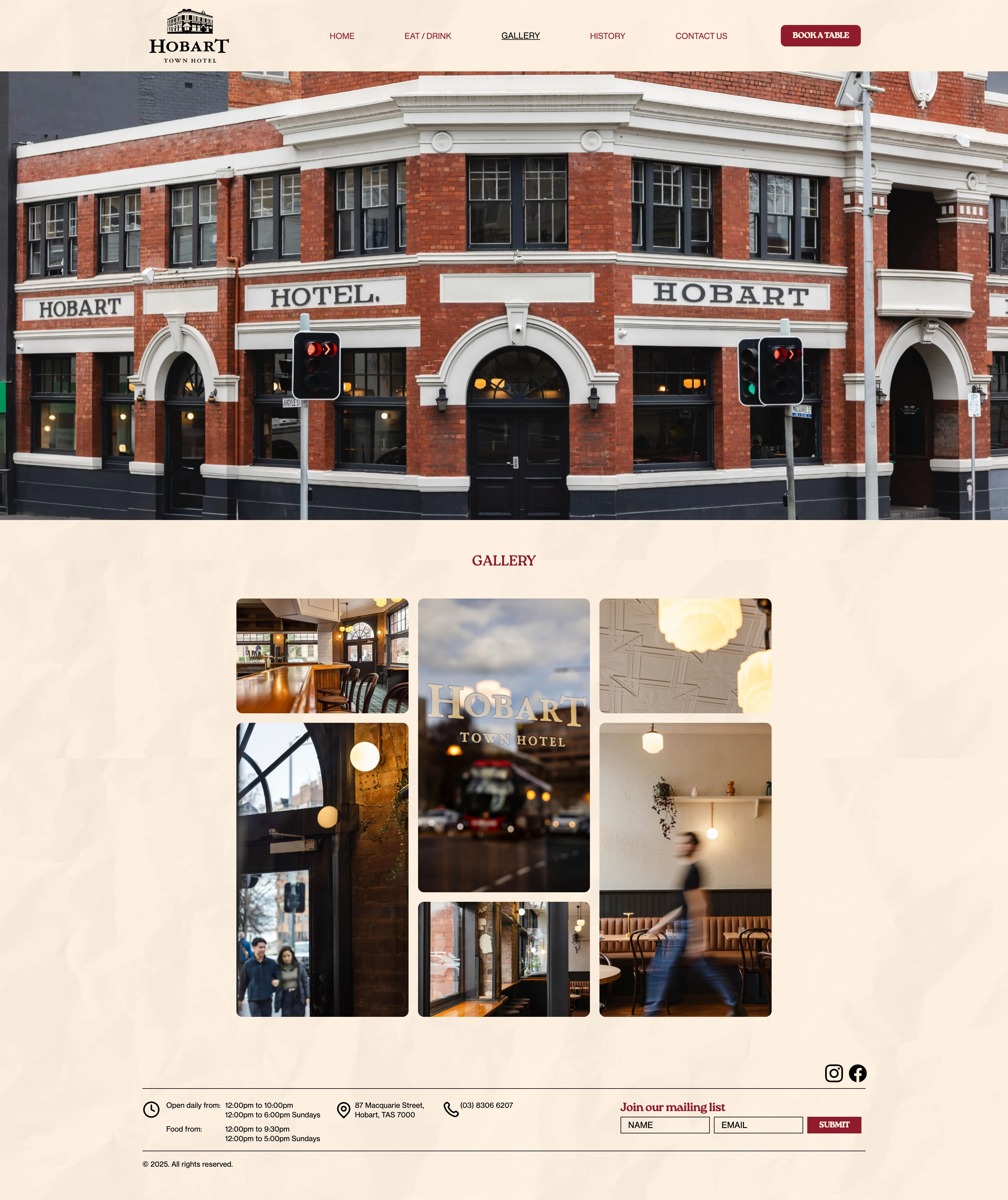 I designed and built the Hobart Town Hotel website using Figma and Webflow. My focus was on delivering a clean, easy-to-navigate experience that works just as well on mobile as it does on desktop. I paid close attention to keeping the design true to the hotel's spirit while ensuring everything loads quickly and looks professional.